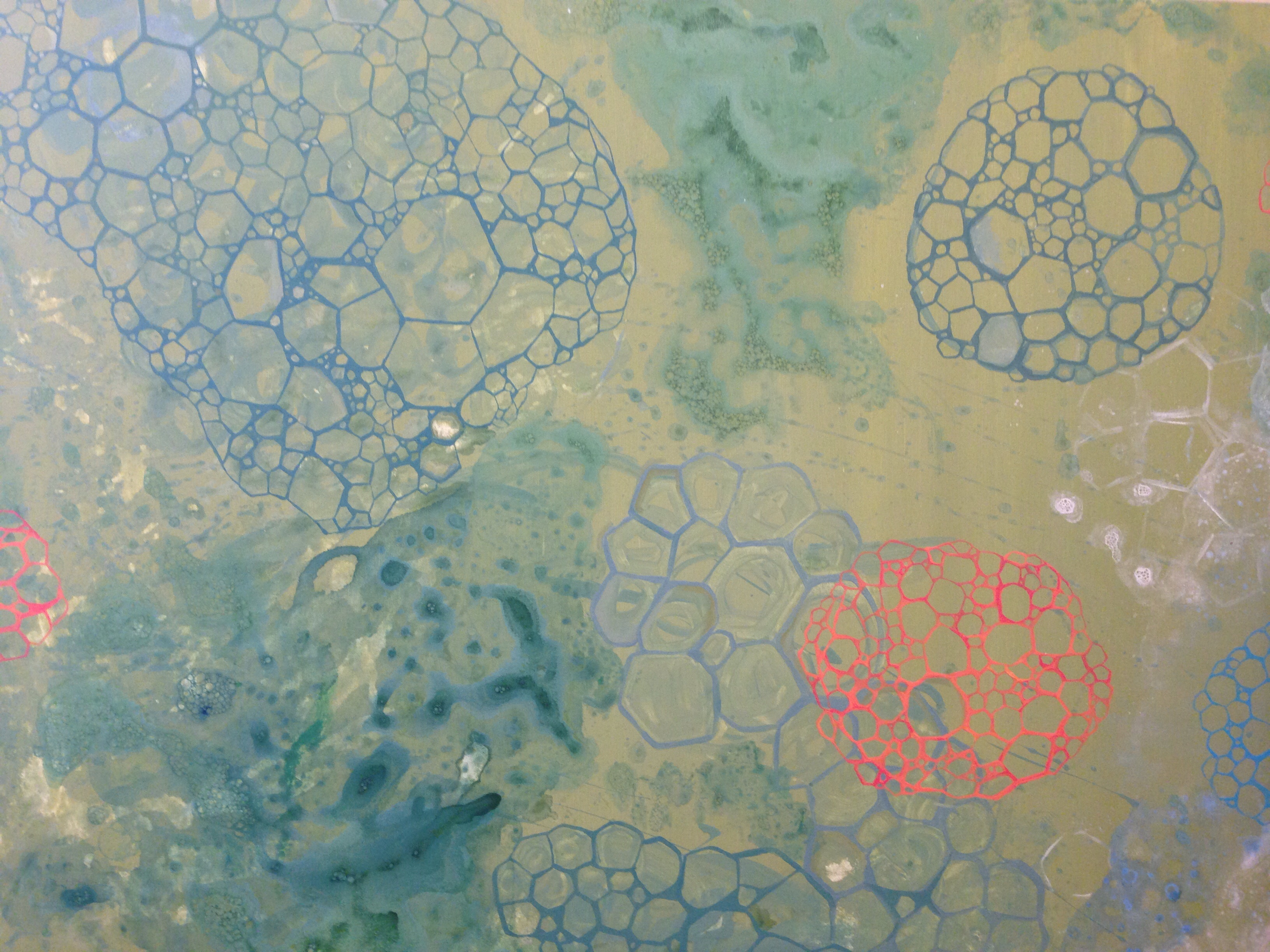 This piece is a combination of actual soap bubbles and the hand painted overtures of geometric patterns with Acrylic.